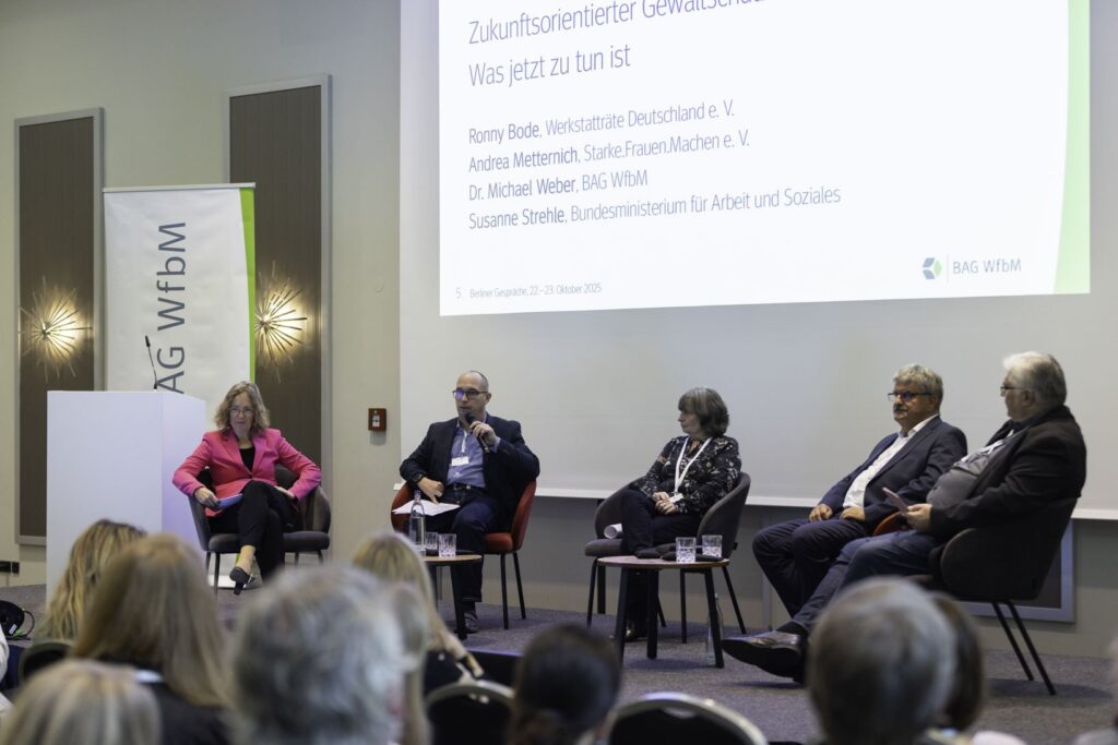 Zwei Tage lang haben sich mehr als 160 Fach- und Führungskräfte aus Werkstätten für behinderte Menschen, aus Tagesförderstätten und aus Inklusionsbetrieben bei den Berliner Gesprächen 2025 zum Thema Gewaltprävention ausgetauscht. Neben Einblicken in die Theorie standen auch interessante Podiumsdiskussionen und Beispiele guter Praxis auf dem Programm.