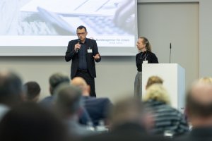 Zum Beginn des zweiten Tages der Delegiertenversammlung berichteten Markus Biskamp, Job-Coach bei der Mosaik-Berlin gGmbH, und Jana Niehaus, Leitung Öffentlichkeitsarbeit und Veranstaltungen bei der BAG WfbM, zum erfolgreichen Schichtwechsel 2025.